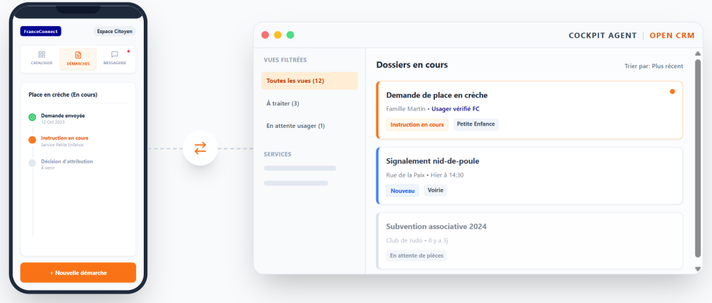 Dès que l’usager envoie sa demande, l’agent reçoit un dossier structuré et complet directement dans sa bannette Open CRM. Plus besoin de jongler entre les boîtes mails et les papiers : il instruit le dossier, et le système informe automatiquement l’usager, au fur et à mesure de l’avancement.