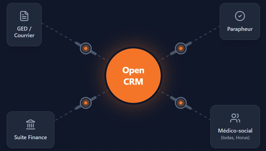 Open CRM, grâce à un outillage adapté, remet en marche la communication entre les acteurs de l’organisme public, les usagers et les partenaires.